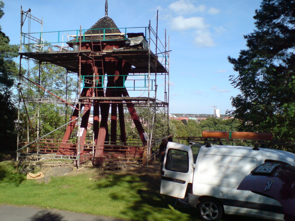 Fornbyn i Trollhättan, nya takspån av spräckt fura