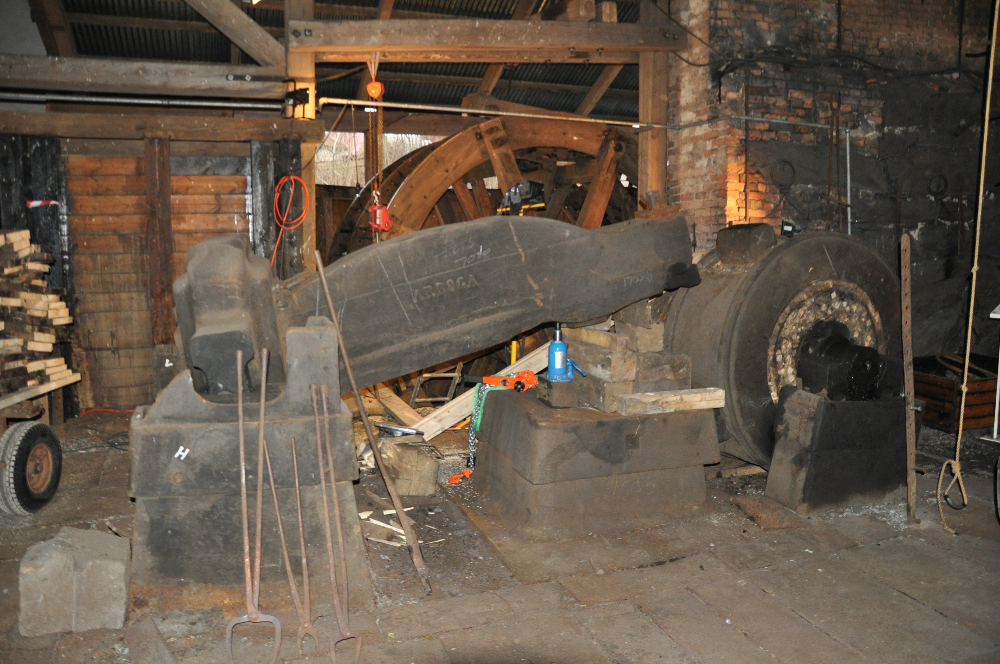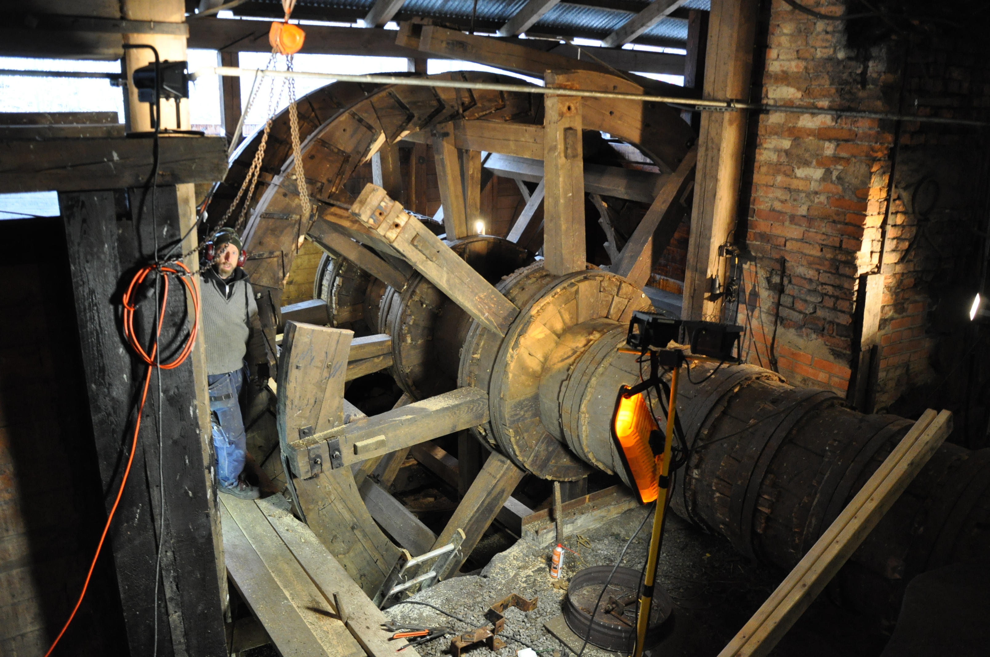 Under Hösten har Mattias Hallgren och Tobias Ed demonterat det ruttna vattenhjulet från drivaxeln. Vattenhjulet nybyggdes under 1980 talet i ett AMS-projekt med ledning av Riksantikvarien. Tyvärr blev flera väsentliga konstruktionsdetaljer samt virkesvalet felaktigt så hjulets livslängd begränsades. Nu har ett nytt kraftgrepp gjorts av bruksföreningen, Skinnskattebergs kommun, Länsstyrelsen i Västmanland och museet tillsammans med Traditionsbärarna för att återuppbygga ett nytt vattenhjul på ett mer historiskt korrekt vis. Målet är att under vintern och våren 2015 tillverka hjulets alla delar. det går åt ca 10m3 virke till det 4,2m x 3m stora vattenhjulet. Hjulet driver den 7 ton tunga mumblingshammaren som används för att smida ut tackjärnet i första steget i lancashirsmidesprocessen.