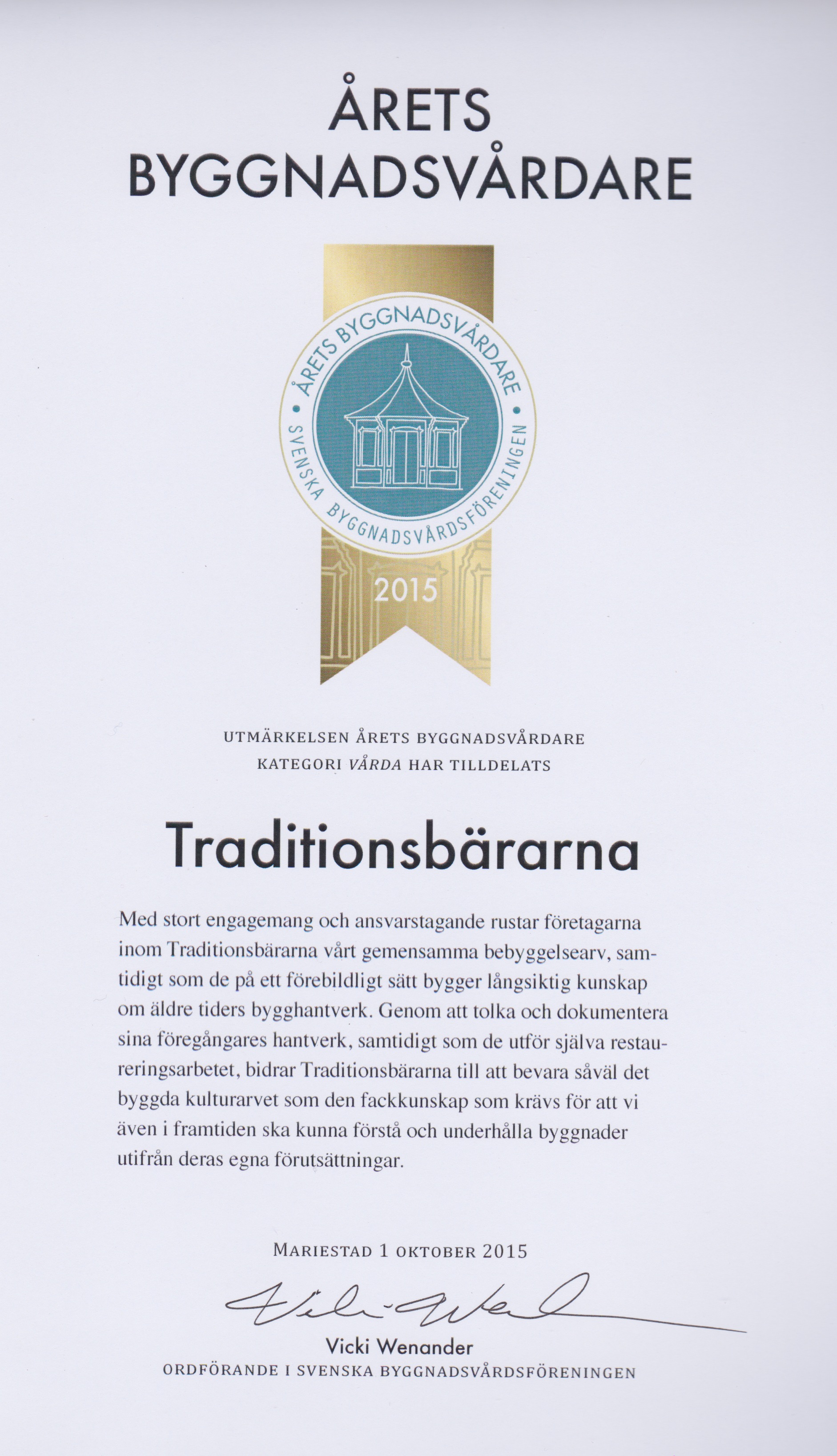 Vi är mycket glada att svenska byggnadsvårdsföreningen uppskattar det engagemang och arbete vi lägger på att förstå och vårda kulturarvet. TACK.